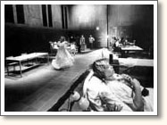 The scenography is 10 x 24 x 7 meters. A split and torn space, which represents a psychiatric hospital. It was the first time that a scenography was designed like this, in the whole width of the space of the factory building, the Transformatorhuis.