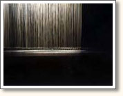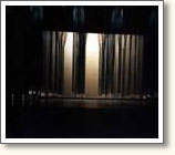 Above the stage area of 10 x 10 meters 25 blue curtains are rolled up and hang invisibly in the air. During the performance these curtains fall down seperately or in groups en cover up the sightlines of the audience. Once hanging the curtains can turn around vertically in two directions and in different tempi. The audience can walk around the moving scenography and determine their own place to look at the performance.