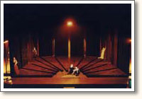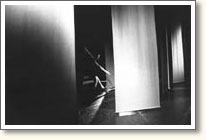The scenography is a closed space of 8 x 8 x 7 meters, completely covered with a black velvet cloth. The floor is divided from the centre axe in twelve segments. These segments can move seperately in and out the space. In other words, one part of the floor connected with a part of the wall can move out of the black space. At the end the whole space is opened and is 13 x 13 x 7 meters.