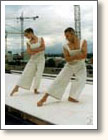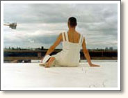 A long floating dance stage on the roof of Weinhaus Huth; one of the few original buildings still remaing at the Potzdamer Platz. The audience is seated on both sides of the floor. The floor goes beyond the roof on both ends and floats in the air.